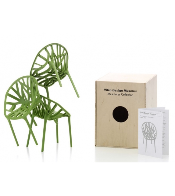 Vitra Miniature Vegetal, Bouroullec: Miniatures Collection: La "Miniatures Collection" del Museo Vitra Design abarca objetos clave de la historia internacional del diseño de 1850 hasta hoy. Todas las miniaturas son réplicas exactas de los originales en cuanto a construcción, material y color. Las técnicas de fabricación fueron adaptadas en un esmerado proceso de desarrollo a las exigencias de la miniaturización. Gracias a esta fidelidad al original, las miniaturas no sólo son un objeto de coleccionista para los aficionados a los muebles, sino también un material ilustrativo ideal para universidades y escuelas de diseño. Ya pueden obtenerse más de 80 modelos a escala 1:6 y la colección es desarrollada continuamente. Todos los modelos vienen embalados en una pequeña caja de madera acompañados de un folleto que explica el diseño. Los ingresos netos de la venta de miniaturas son destinados a las exposiciones y los talleres del Museo Vitra Design.