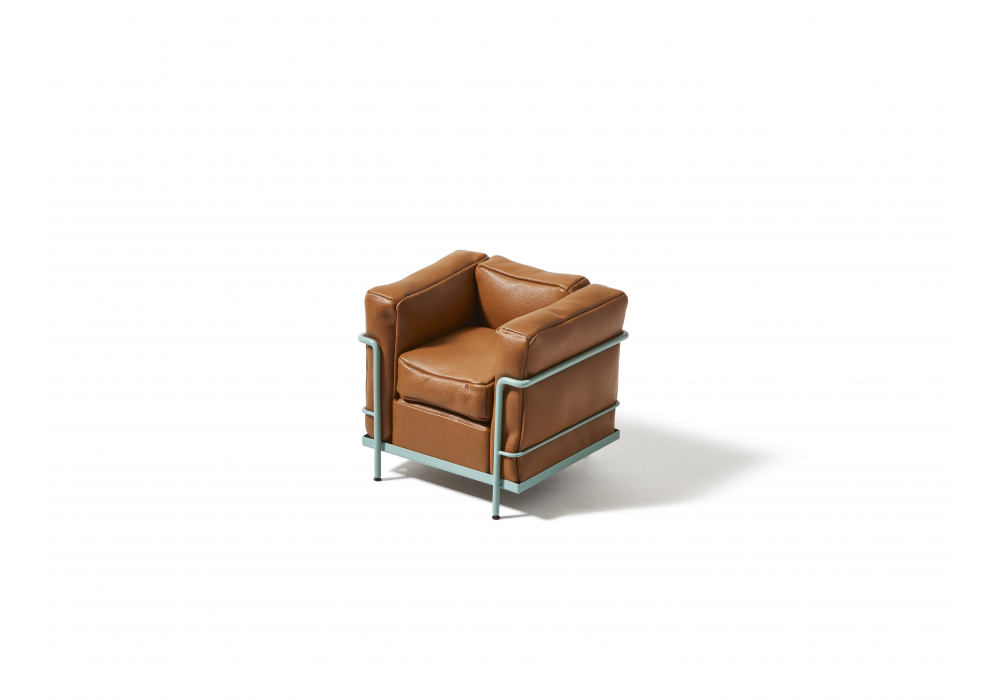 LC2 diseñada por Le Corbusier, Pierre Jeanneret, Charlotte Perriand para Cassina es una miniatura realizada con una estructura verde y tapizado de cuero color tabaco.