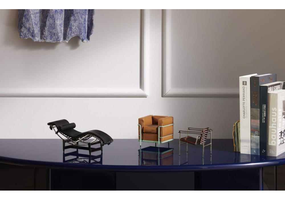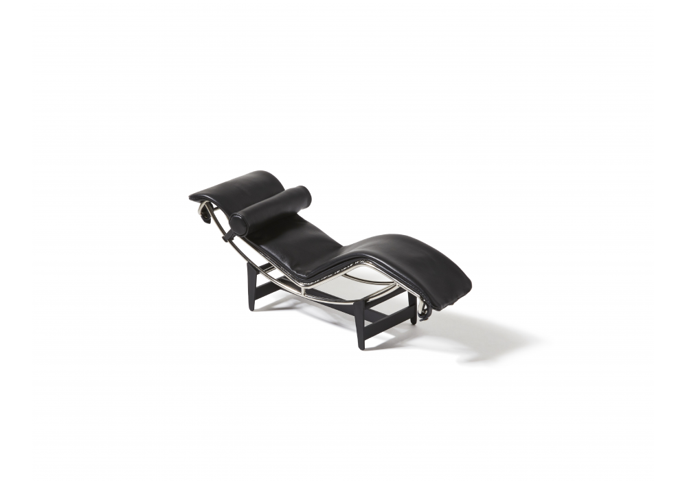 Le Miniature - 4 Chaise Longue à Reglage Continu diseñada por Le Corbusier, Pierre Jeanneret, Charlotte Perriand para Cassina es una miniatura realizada con estructura cromada y tapizado en piel negra.