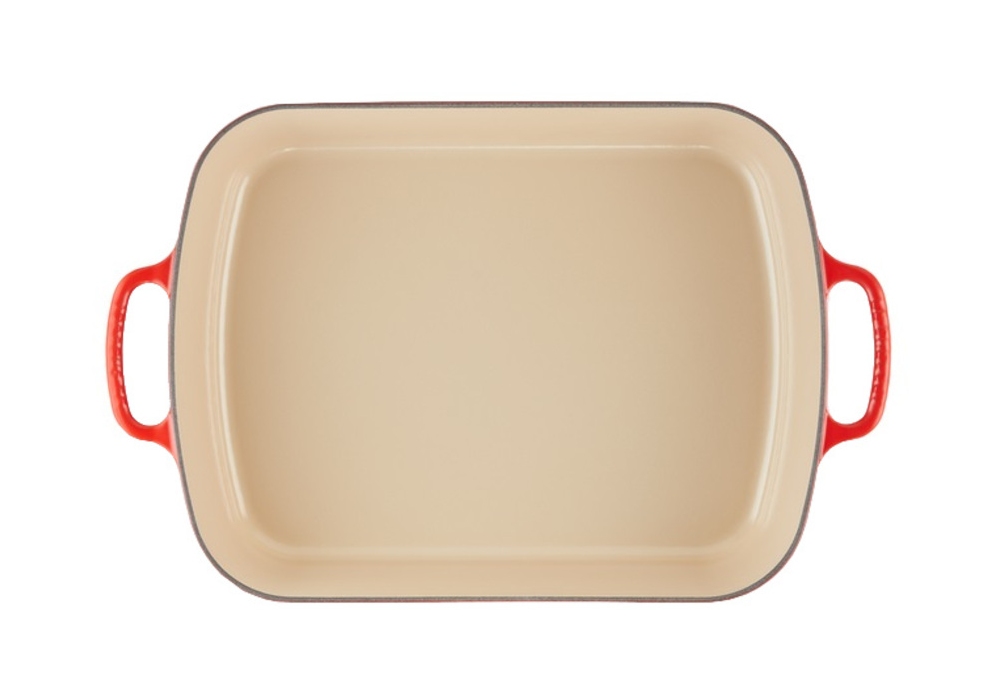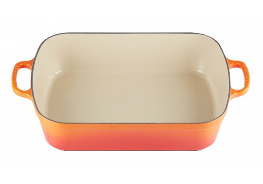 Pirofila Rettangolare Evolution diseñada por Le Creuset es una fuente de horno rectangular en hierro fundido disponible en diferentes colores. Acabado interior blanco a excepción del plato negro que tiene un interior negro.
