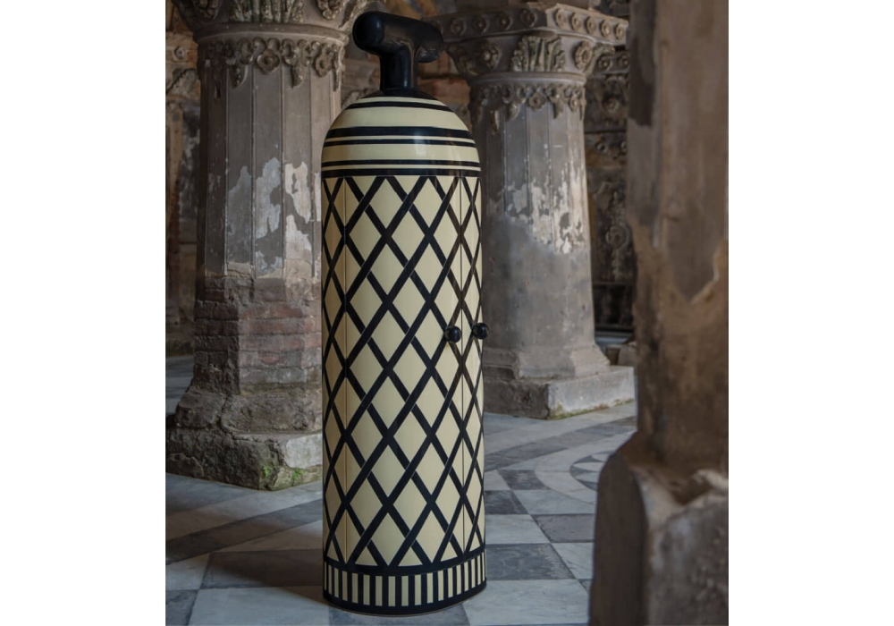 Monsieur Verdoux diseñado por Matteo Cibic para Scarlet Splendor es un mueble bar realizado en MDF, madera contrachapada y madera de teca con incrustaciones de resina.