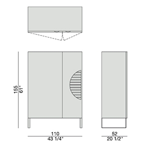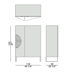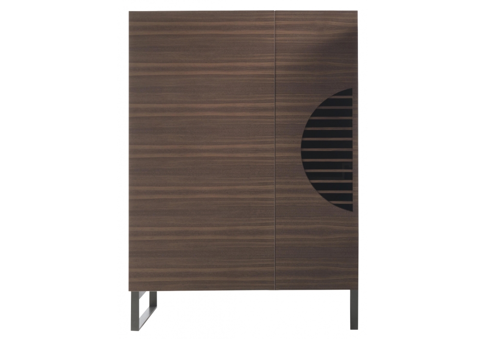Polifemo diseñado por G. Azzarello para Porada es un mueble bar de dos puertas en nogal canaletta con patas de metal gris peltre. En el interior hay un compartimiento iluminado con luz de LED con tapa extraíble de madera, cajón, bandeja de madera, estantes de cristales y de madera. La manija se encuentra en la parte superior de la puerta. Disponible con la apertura de la puerta a la izquierda o a la derecha.