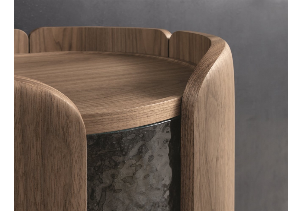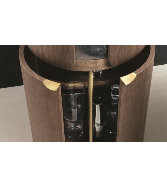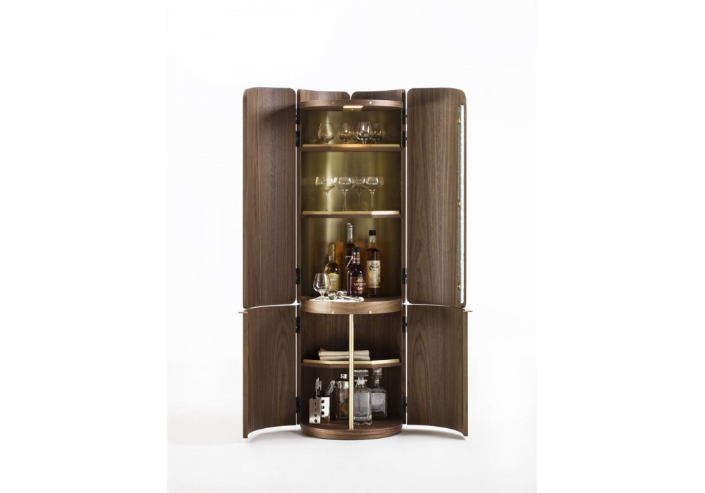 Mary diseñado por P. Jouin para Porada es un mueble bar de nogal canaletta. Es equipado con un compartimento inferior y otro superior. Puertas curvas con detalles en cristal ICE. Compartimento superior con luz LED recargable USB y dos estantes en acabado madera.