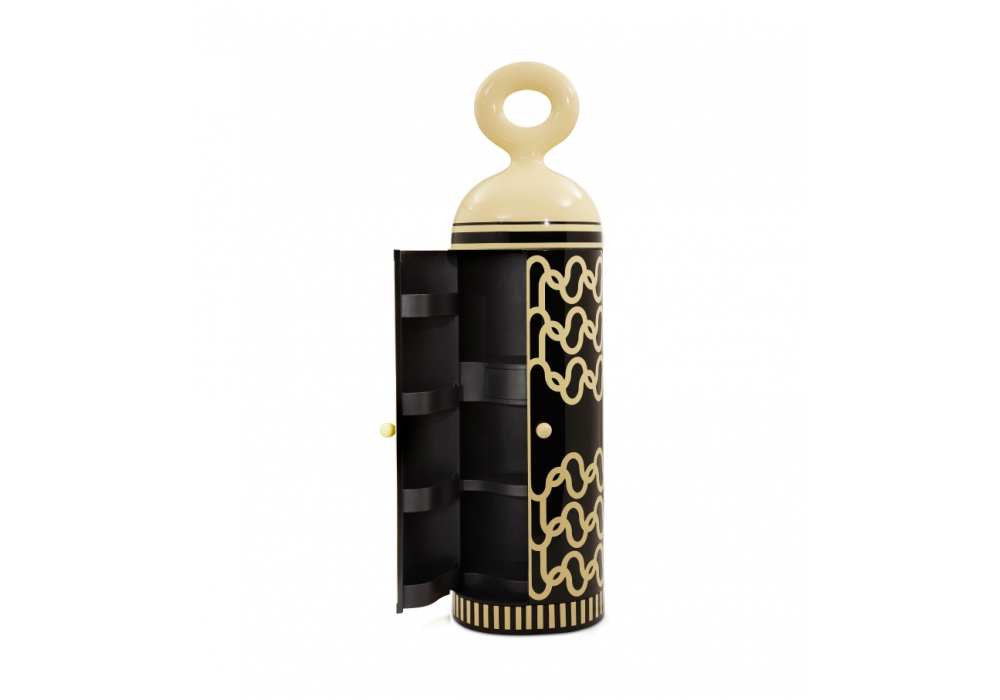 Madame Verdoux diseñado por Matteo Cibic para Scarlet Splendour es un mueble bar hecho de MDF, madera contrachapada, incrustaciones de resina, madera de teca y cuero.