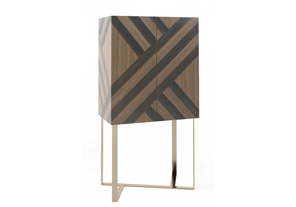 Cross diseñado por Christophe de Sousa para Gual Design es un mueble bar con estructura y puertas en MDF chapado en nogal y eucalipto ahumado. Con 2 baldas de cristal. Base en hierro pintado en resina epoxi negra o acero inoxidable dorado.