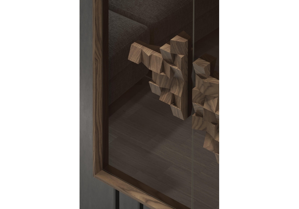 Jackson diseñado por Gualter Torres para Gual Design es un mueble bar con base en hierro pintado negro o acero inoxidable dorado. Estructura con 2 puertas en chapa de nogal con dos estantes internos.