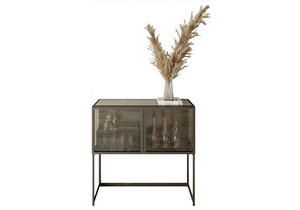 15.55 Elvis diseñado por E-ggs para Bontempi es un mueble bar con estructura de acero pintado en latón oscuro y aluminio. Puertas batientes, laterales y plano superior en cristal transparente color bronce. Estructura inferior de acero lacado en latón oscuro. Posibilidad de añadir estante en chapa de acero pintado latón oscuro, estante en cristal bronce transparente.