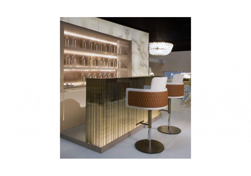 Avantgarde diseñado por Reflex Angelo es un mueble bar compuesto por: mueble de pared como versión especial de la librería Avantgarde en madera lacada brillo con aplicaciones de cristal lacado biselado en los frentes y traseras en cristal lacado blanco, espejo ahumado, nogal Canaletto o en cristal Marble, con 2 estantes largos y 4 puertas; Barra de bar con luz en cristal extraclaro, bronce o ahumado con acabado esmerilado y abujardado o en cristal con diseño de fantasía Vienna; plataforma en acabado brillante a juego con la librería. Opcional portanotas refrigerado e iluminación Led en los estantes.