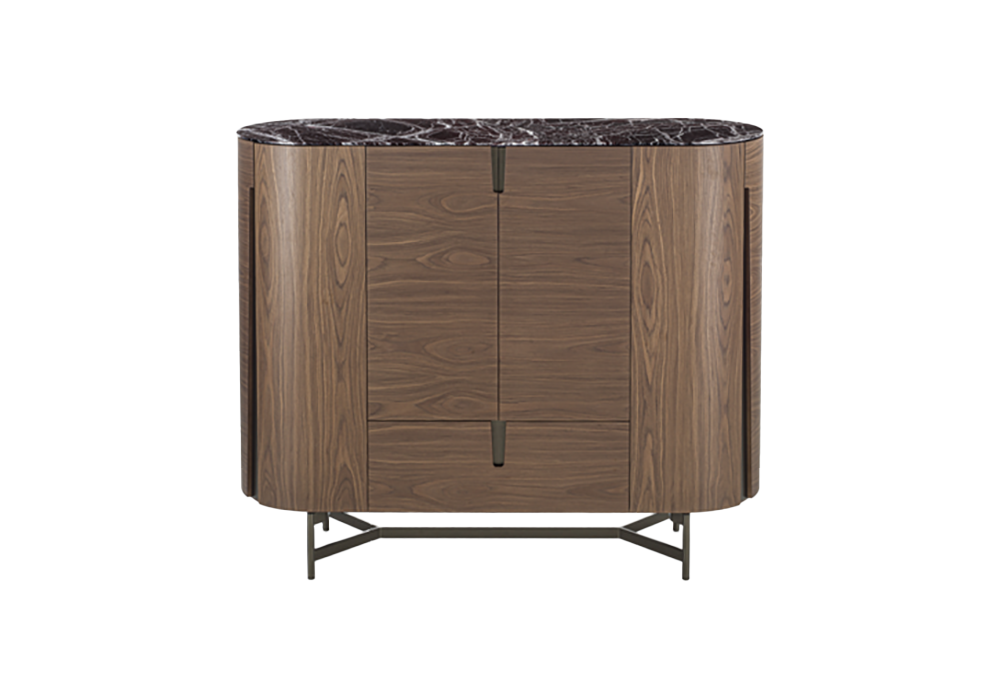 Tylsa diseñado por D. Radice para Porada es un mueble bar con estructura de fresno o nogal canaletta con cuatro puertas batientes y un cajón central. Los compartimentos laterales cuentan con dos estantes de cristal transparente extraclaro, mientras que el compartimento central se caracteriza por un panel trasero extraíble de espejo ahumado retroiluminado y, en la parte superior, un posavasos de madera maciza. La superficie de apoyo es de cristal extraclaro retrolacado con separadores de cajones en Cuoietto. Todo el mueble bar cuenta con iluminación LED integrada con sensor de apertura.