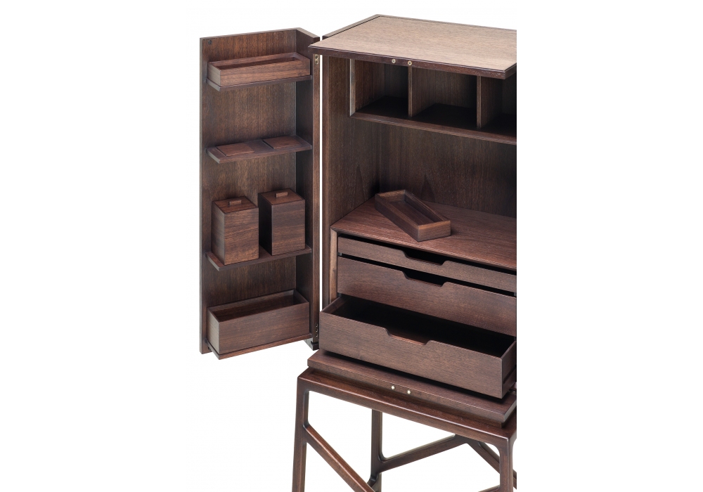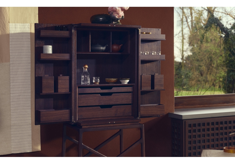 Teahouse diseñada por Christophe Pillet para Ceccotti Collezioni, es un mueble contenedor de nogal americano macizo y contrachapado chapado. Disponible en la versión estándar con un estante de nogal y 4 compartimentos por puerta, o en la versión con accesorios, con una cómoda de nogal de 3 cajones, un organizador dividido en 3 compartimentos y 5 cajas de nogal de diferentes alturas por puerta.