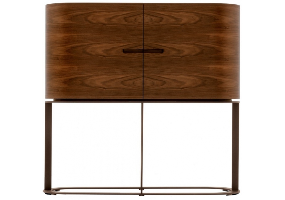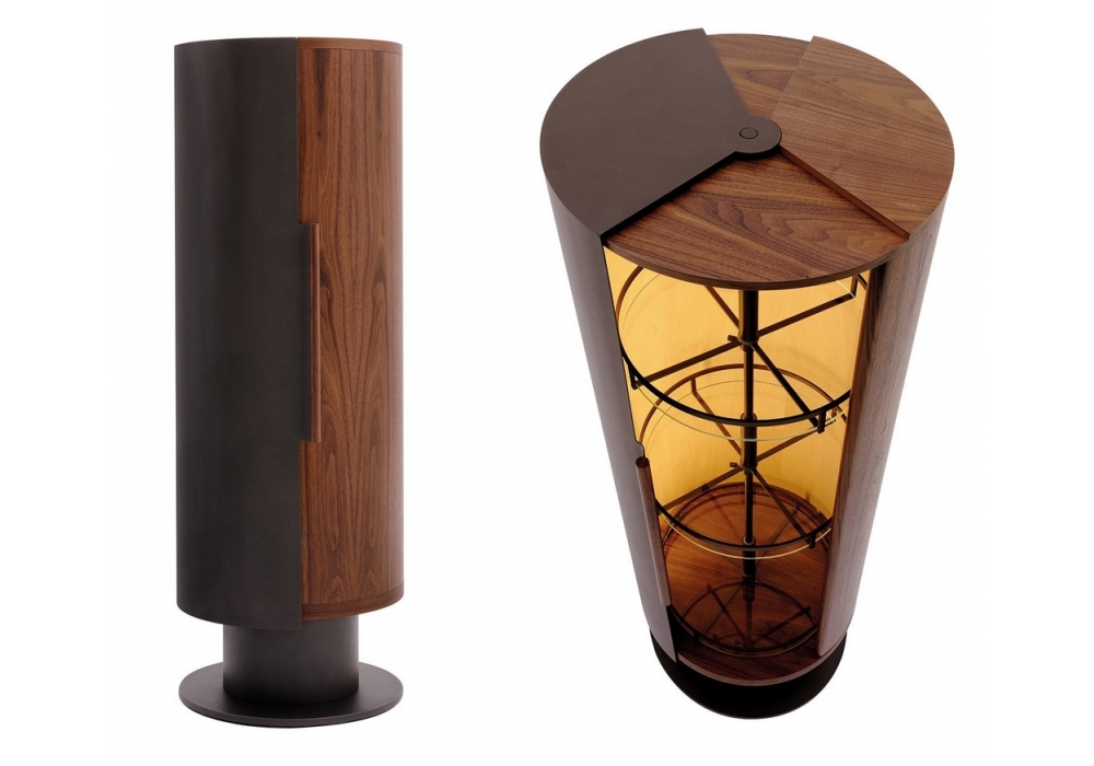 Ino diseñado por Chi Wing Lo para Giorgetti es un mueble bar de una o dos puertas en nogal canaletto. En la versión cilíndrica la estructura de la puerta es de metal curvado. La parte interior está disponible en dos versiones: Sycomore frisè teñido de blanco o decoración en pan de oro. El mueble se suministra de serie con bandejas giratorias en metal pintado bronce: son regulables en altura y tienen tapas de cristal y luces LED. La base es de metal pintado bronce.