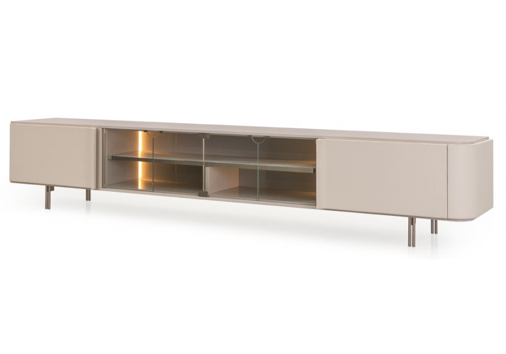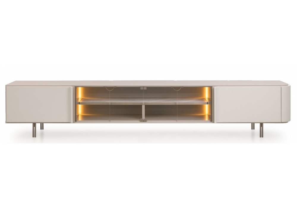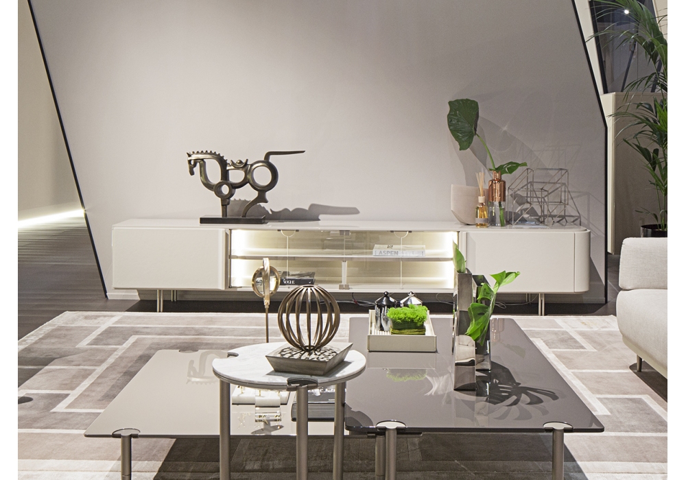 Zero diseñado por Andrea Bonini para Turri es un mueble TV con estructura de MDF y paneles de aglomerado lacado brillante. Hay dos puertas de madera recubiertas de cuero y dos de cristal, dos compartimentos equipados cada uno con un estante de cristal, un compartimento lateral con puerta de cristal, equipado con iluminación LED y un estante de madera lacada o de mármol. Patas y detalles en acabado mate. Disponible en dos dimensiones.