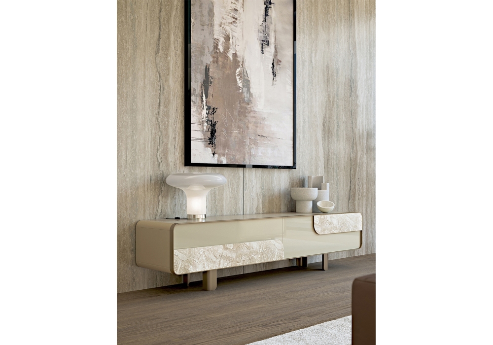 Soul diseñado por Giuseppe Viganò para Turri es un mueble TV con estructura de MDF y paneles de aglomerado lacado brillante. Piezas metálicas en acabado mate. Son dos cómodas con detalles decorativos en nogal o mármol.