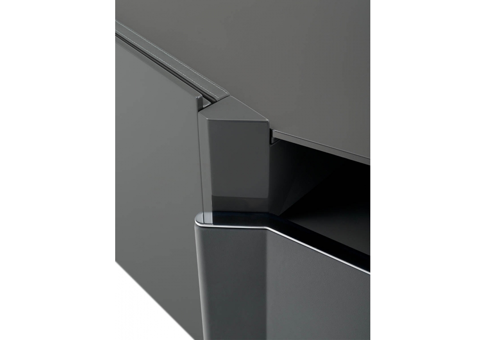 Zenit diseñado por Andrea Bonini para Turri es un mueble TV con estructura de MDF y madera contrachapada en acabado poliéster lacado brillante y tapizado en piel. Hay tres compartimentos internos equipados y un compartimento abierto con prensaestopas. Tres puertas de madera en acabado lacado monocolor y un cajón con revestimiento de microfibra.