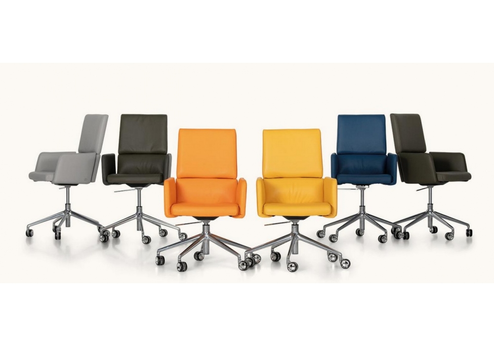 DS-414 diseñada por de Sede Design Team para De Sede es una silla con ruedas regulables en altura con mecanismo basculante y giratorio. Base de cuatro radios con llantas de aluminio pulido y tapizado SEDEX con acolchado SEAT-Lux en piel o tela con costuras tono sobre tono hechas a mano. Disponible en diferentes medidas y acabados.
