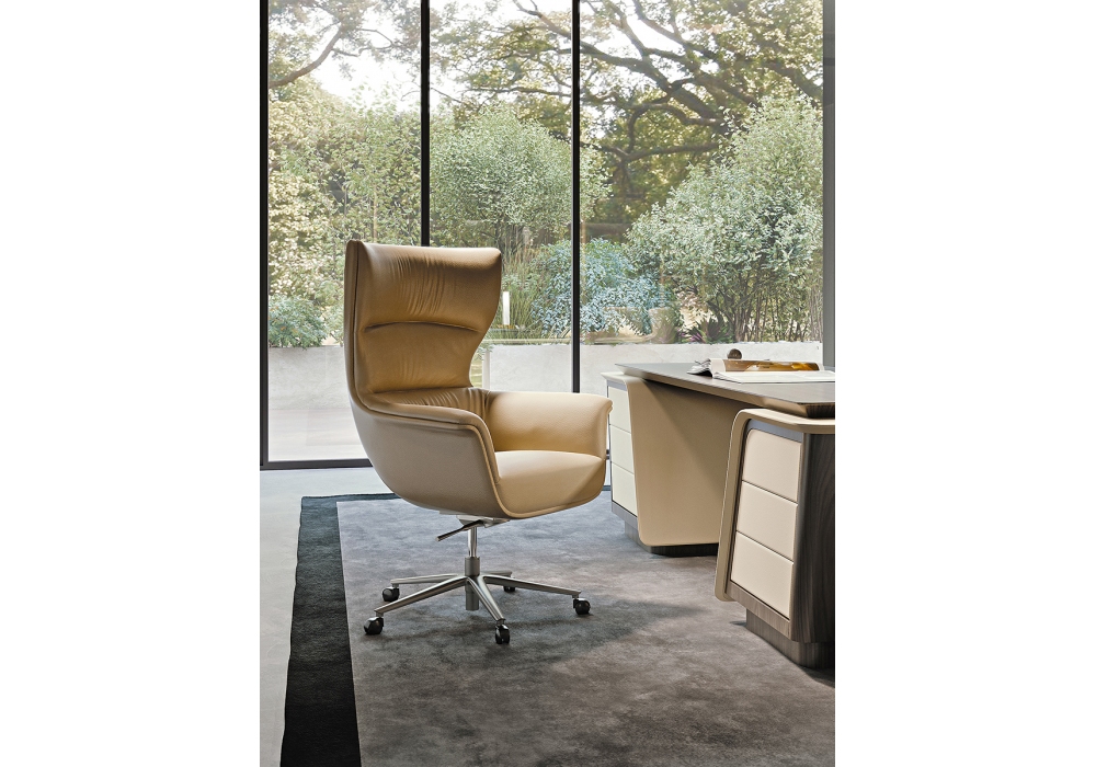 Blues diseñada por Giuseppe Viganò para Turri es una butaca de oficina con estructura en madera contrachapada y madera maciza con revestimiento de tela o piel no desenfundable y cojines en espuma de poliuretano multidensidad. La base con ruedas está fabricada en metal con acabado mate. El sillón está equipado con el mecanismo de ajuste Synchron Top con profundidad de asiento ajustable. Altura ajustable.