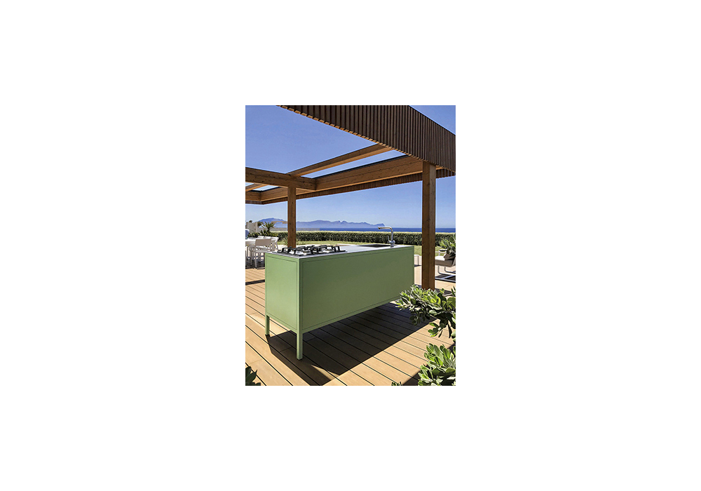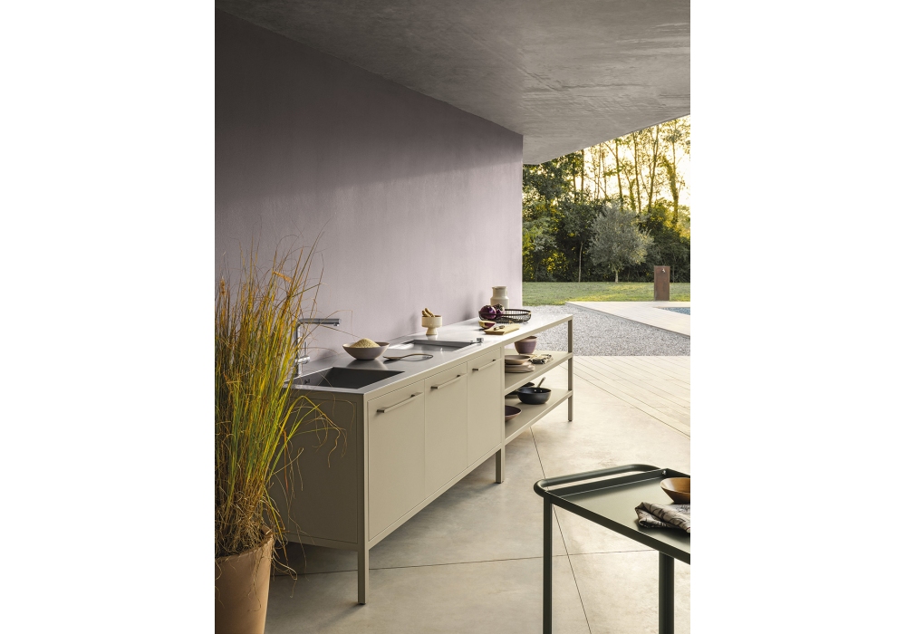 Frame Outdoor diseñada por Salvatore Indriolo para Fantin es una encimera / cocina disponible para exterior gracias a un tratamiento de cataforesis que evita la formación de óxido. Compuesto por tapa de acero inoxidable y estructura disponible en diferentes acabados. Posibilidad de agregar accesorios y diferentes configuraciones.