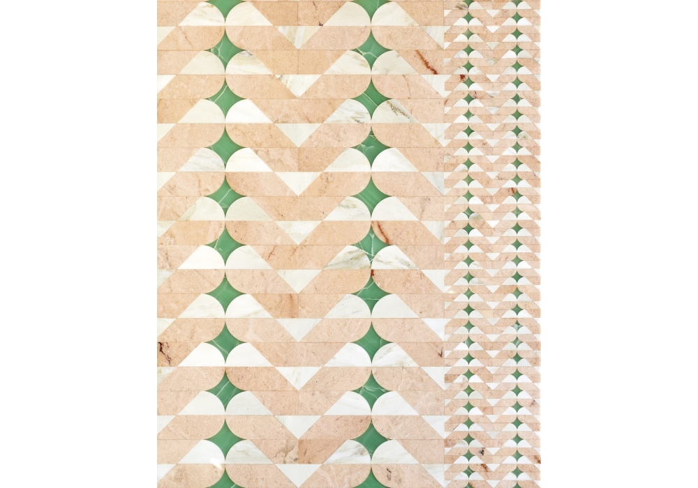 Amelie diseñado por Patricia Urquiola para Budri es un panel decorativo de pared o suelo modular realizado en Salmon Pink de Portugal, Estremoz Pink de Portugal y mármol Onyx Verde Aquarel.
