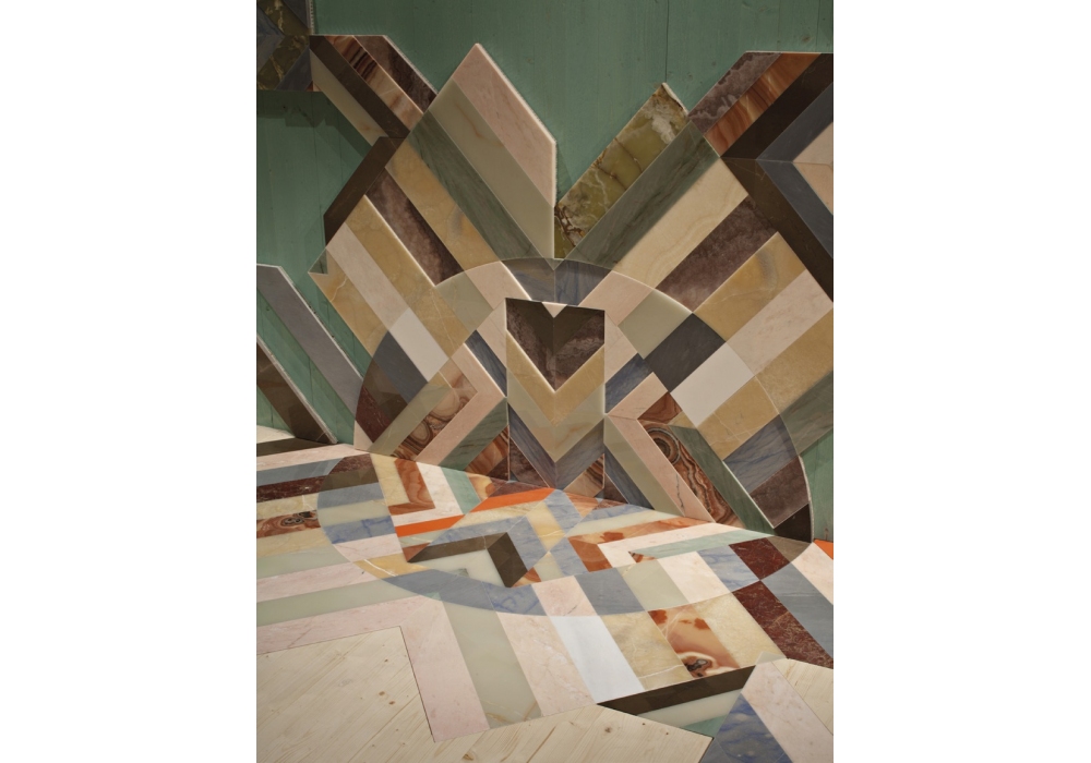 Earthquake diseñado por Patricia Urquiola para Budri es un panel decorativo de piso / pared realizado con fragmentos de mármol y piedras semipreciosas, provenientes de las losas dañadas por el terremoto. Preciosos mármoles y ónices intercalados con geometrías de resina de color mandarina forman una gran decoración de efecto lenticular. Parte de la incrustación se desliza hasta el suelo, donde las incrustaciones Kilim fluyen hacia la madera.