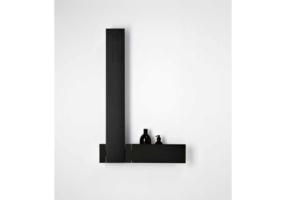 Sen firmado por Gwenael Nicolas, Curiosity para Agape es un grifo de ducha de pared con cabezal de ducha, fabricado en aluminio anodizado cepillado con acabado negro.