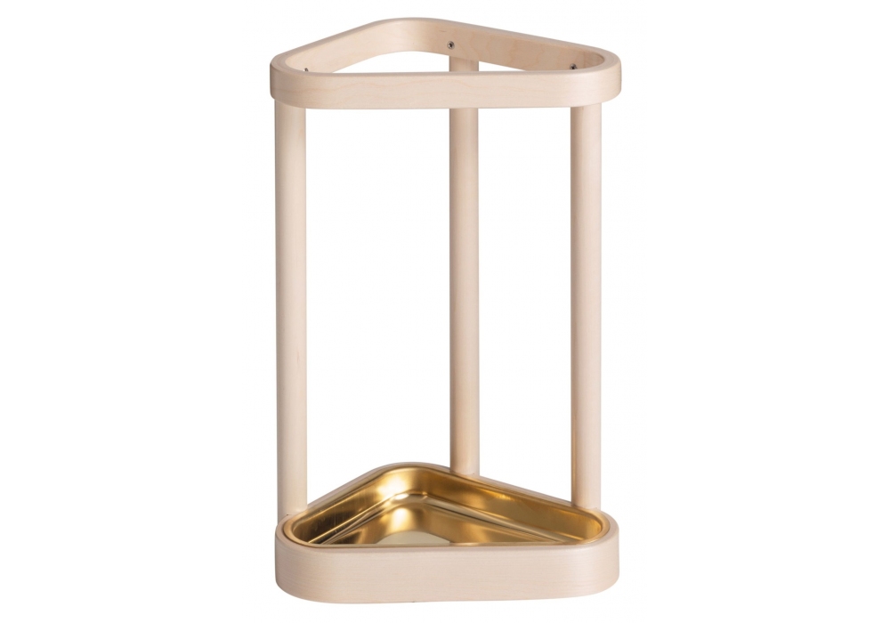 Umbrella Stand 115 diseñado por Alvar Aalto para Artek es un paragüero realizado con estructura de abedul macizo y bandeja de latón.