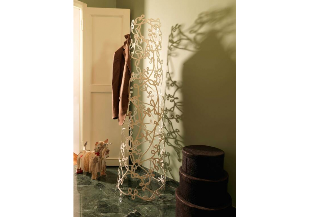 Tuta diseñado por Nendo para Cappellini es un perchero realizado con estructura de metal cortado a láser y pintado mate. Disponible en diferentes acabados.