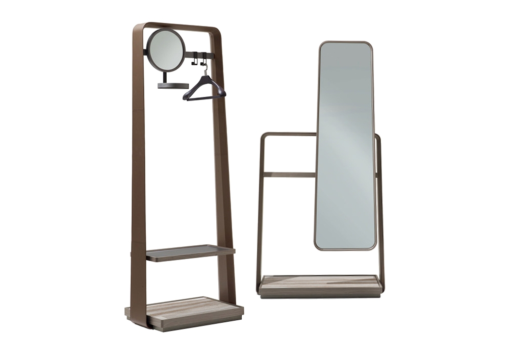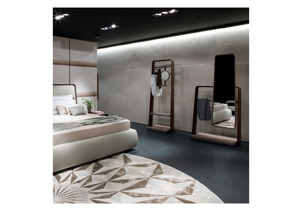 Frame diseñado por Carlo Colombo para Giorgetti es un galan de noche con la base en arce disponible en dos acabados: gris paloma y gris pizarra, y perfil lateral cubierto con cuero. El inserto de la base es de mármol disponible en oro Calacatta, Portoro, Zebrino o Terciopelo Marrón. También hay una versión con espejo y una con un estante adicional.