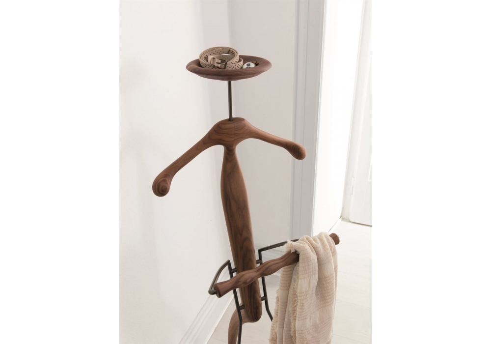 Sir-Bis 2 diseñado por M. Marconato & T. Zappa para Porada es un galan de noche realizado en madera maciza de nogal canaletta con estructura en metal. Dotado de un platillo portaobjetos.