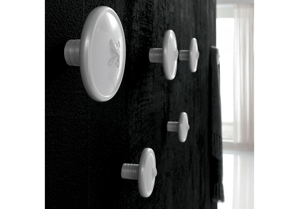 Bottone diseñado por Marzia Fortuzzi para Cattelan Italia es un perchero en poliuretano rígido blanco perla. Disponible en diferentes modelos.