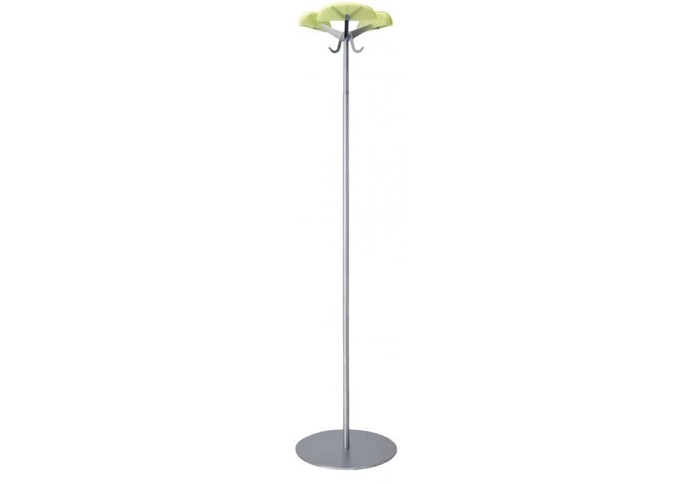 Alta Tensione diseñado por Enzo Mari para Kartell es un perchero realizado con base y montante en acero, soportes y ganchos en aluminio y tapas en PMMA pintado resistente a los arañazos teñido en masa.