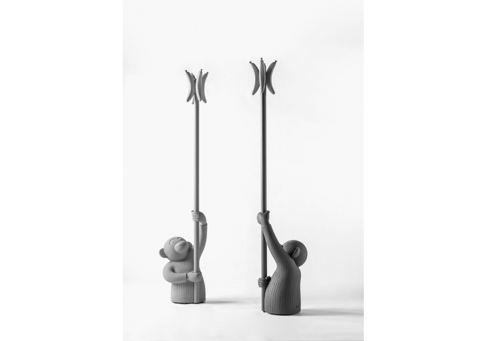 Monkey diseñado por Jaime Hayon para BD Barcelona es un perchero la base es en hormigón, el poste y la banana en fresno macizo, está disponible en negro o gris.