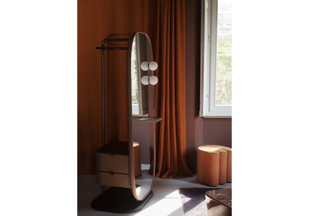 Weekend diseñado por Federico Peri para Baxter es un galan de noche con estructura tubular en metal bruñido. Estructura, estante y espejo trasero revestidos en piel. Cómoda revestida de cuero con tablero de metal bruñido. Estructura de cajones y base en roble cepillado teñido en diferentes tonos. Revestimiento solo en pieles suaves.