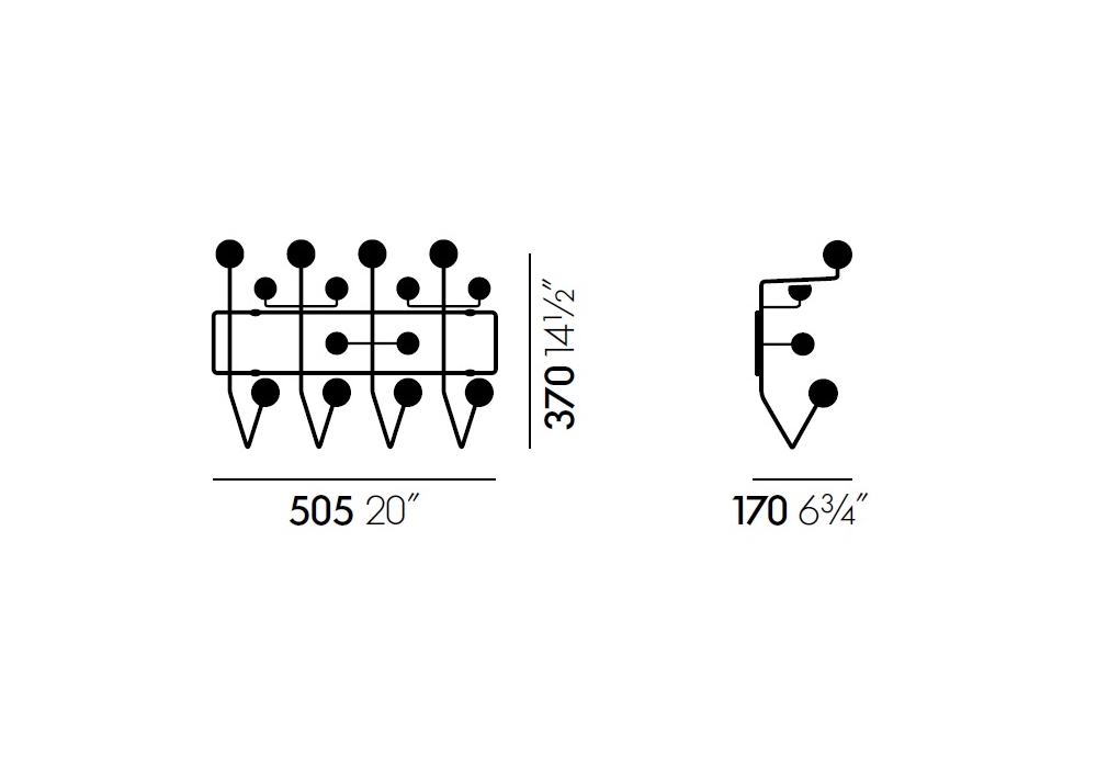 Vitra Hang il all: En el perchero «Hang it all», los ganchos han sido sustituidos por unas bolas de madera de vivos colores que animarán a los niños a colgar en ellas todas sus cosas. Como la distancia entre las bolas es siempre la misma, se pueden montar varios percheros uno a continuación de otro para disponer de almacenamiento adicional. «Hang it all» es una alegre alternativa a los percheros monótonos y aburridos (y no solo para el dormitorio de los niños).