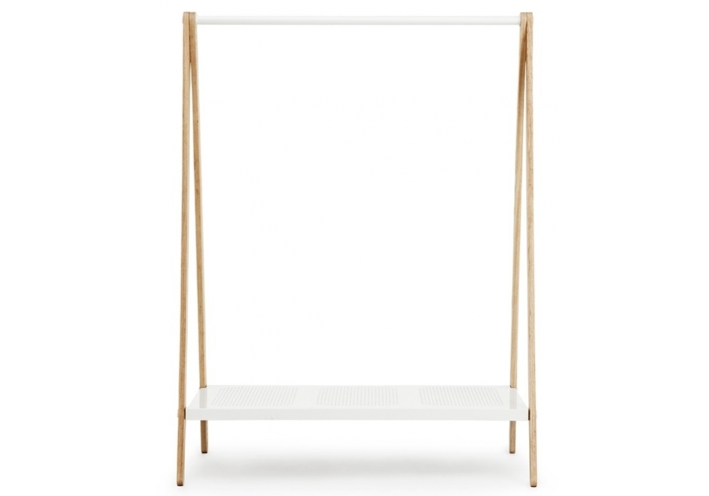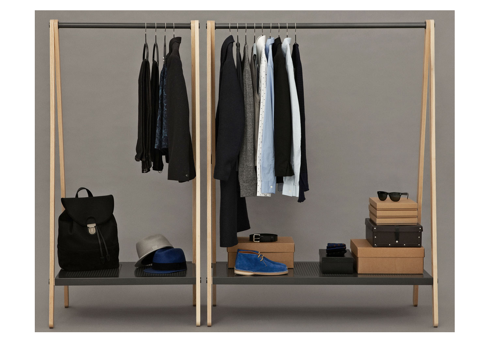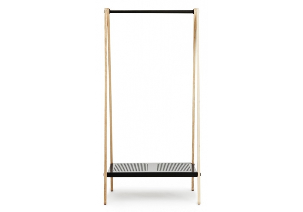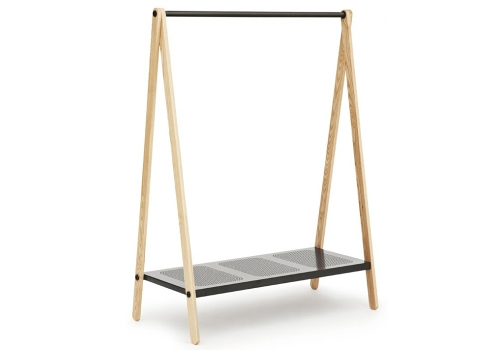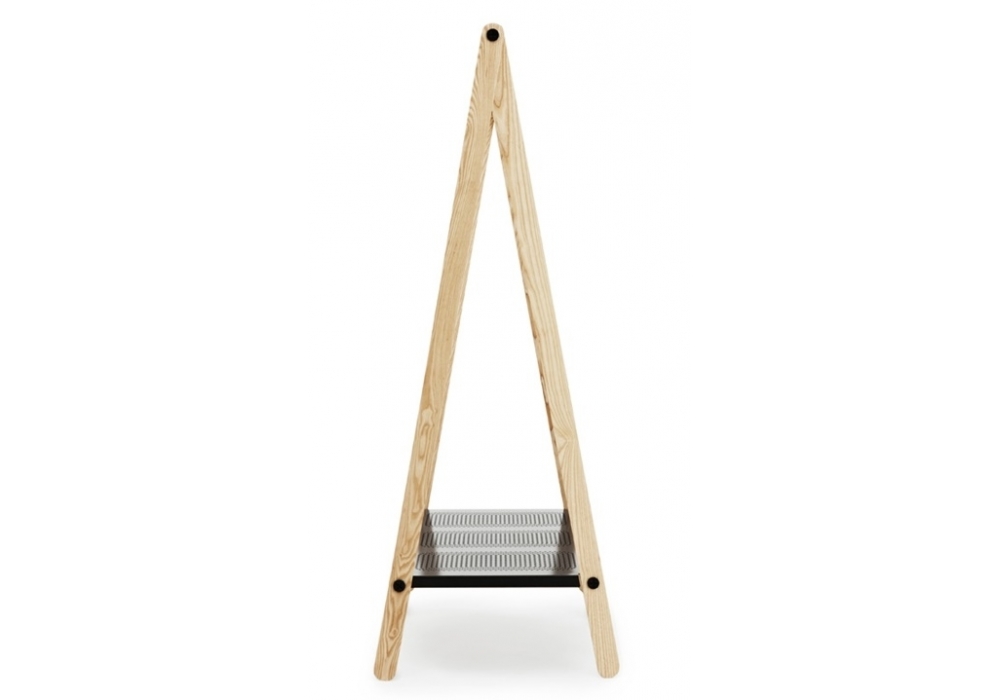 Toj, diseñado por Simon Legald von Normann Copenhagen, es un perchero de pie, realizado con una estructura portante en fresno, y un práctico estante de acero, disponible en gris o blanco.