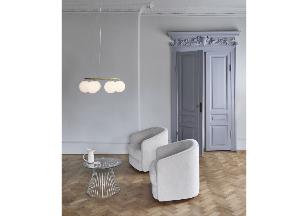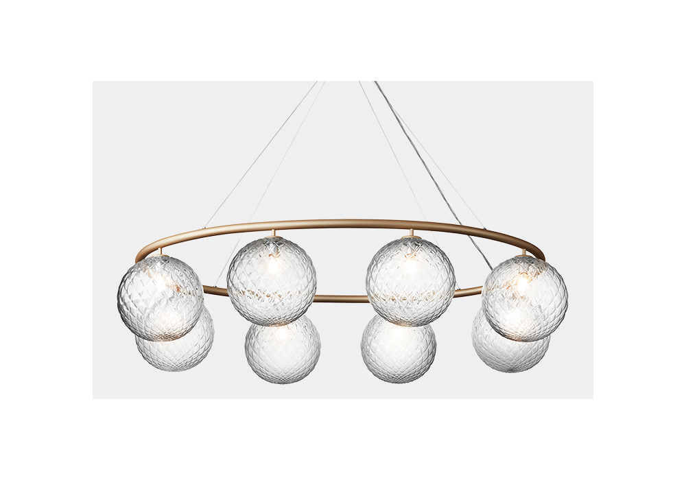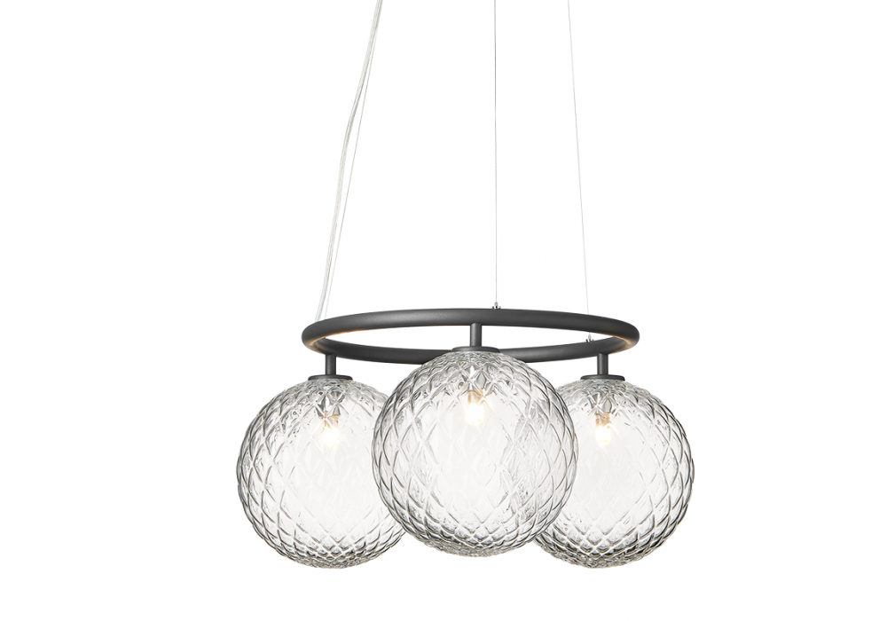 Miira Circular diseñada por Sofie Refer para Nuura es una candelabro caracterizada por un anillo de metal recubierto de polvo y difusores esféricos de vidrio opalino o transparente soplado con motivos en relieve.