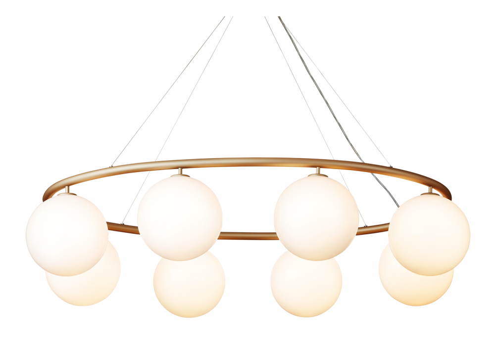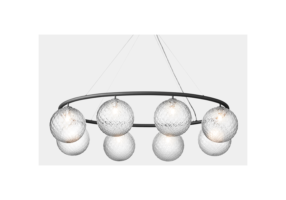 Miira 8 Oval diseñada por Sofie Refer para Nuura es una candelabro caracterizada por un anillo de metal de forma ovalada con recubrimiento en polvo. Difusores esféricos de vidrio soplado opalino o transparente con motivos en relieve.