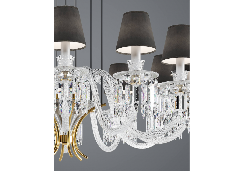 Margot diseñado por Roberta Vitadello para Italamp es un candelabro en cristal y cristal artístico. Pantallas de tela en acabado antracita y estructura portante de metal en negro mate. Detalles decorativos metálicos con acabado en oro claro con piedras.