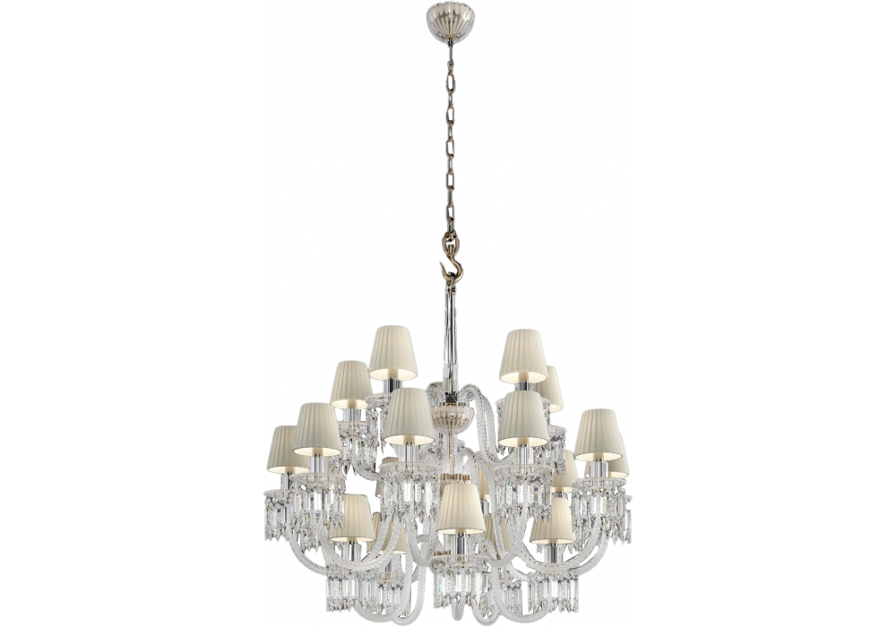 Egle diseñado por Roberta Vitadello para Italamp es un candelabro en cristal y cristal artístico. Pantallas de tela plisada color marfil. Detalles metálicos con acabado cromado y detalle de enganche con acabado oro satinado.