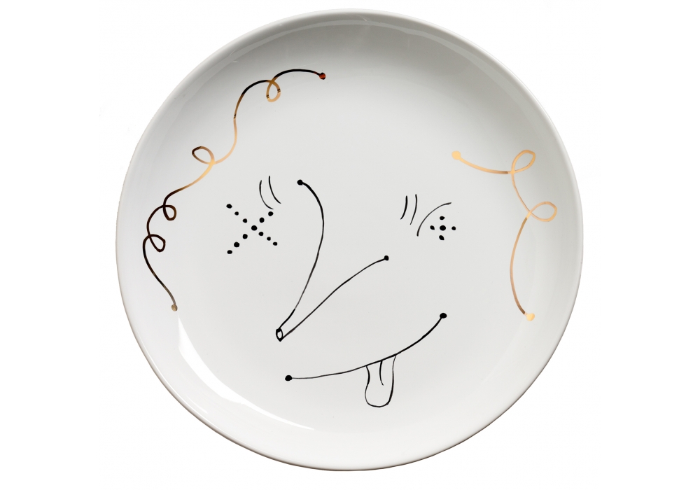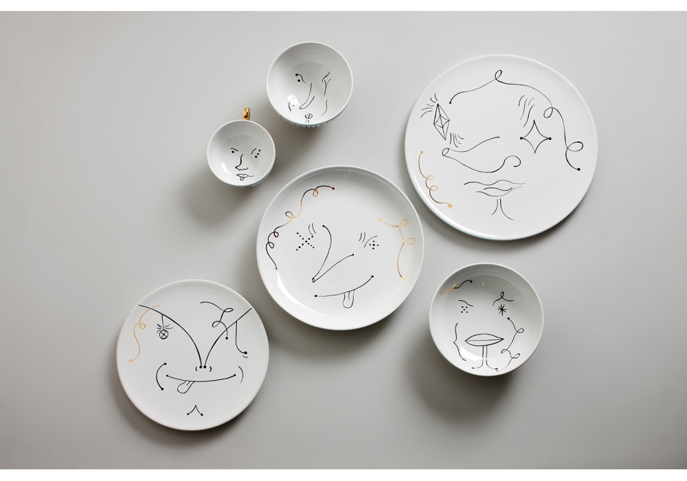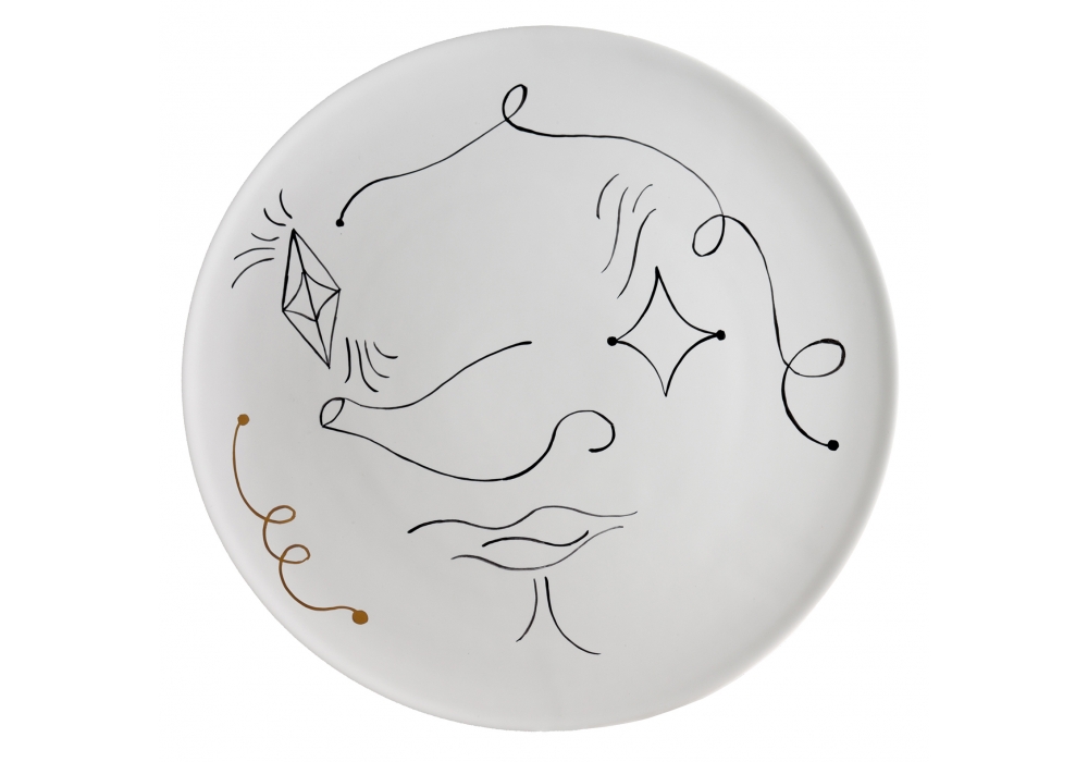 Table collection diseñada por Jaime Hayon para Bosa es una colección de platos para su tabla, hecha de cerámica blanca con decoraciones negras brillantes y detalles del oro, aplicados con un proceso manual. Table collection incluye también tazas, tazones, decantador y kit de la sal y de la pimienta.