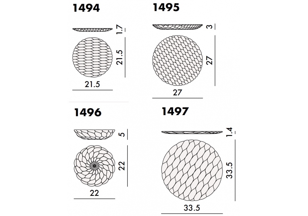 | Dimensiones | 1494_ Ø 21.5 x H 1.7 cm; 1495_ Ø 27 x H 3 cm; 1496_ Ø 22 x H 5 cm; 1497_ Ø 33.5 x H 1.4 cm; |