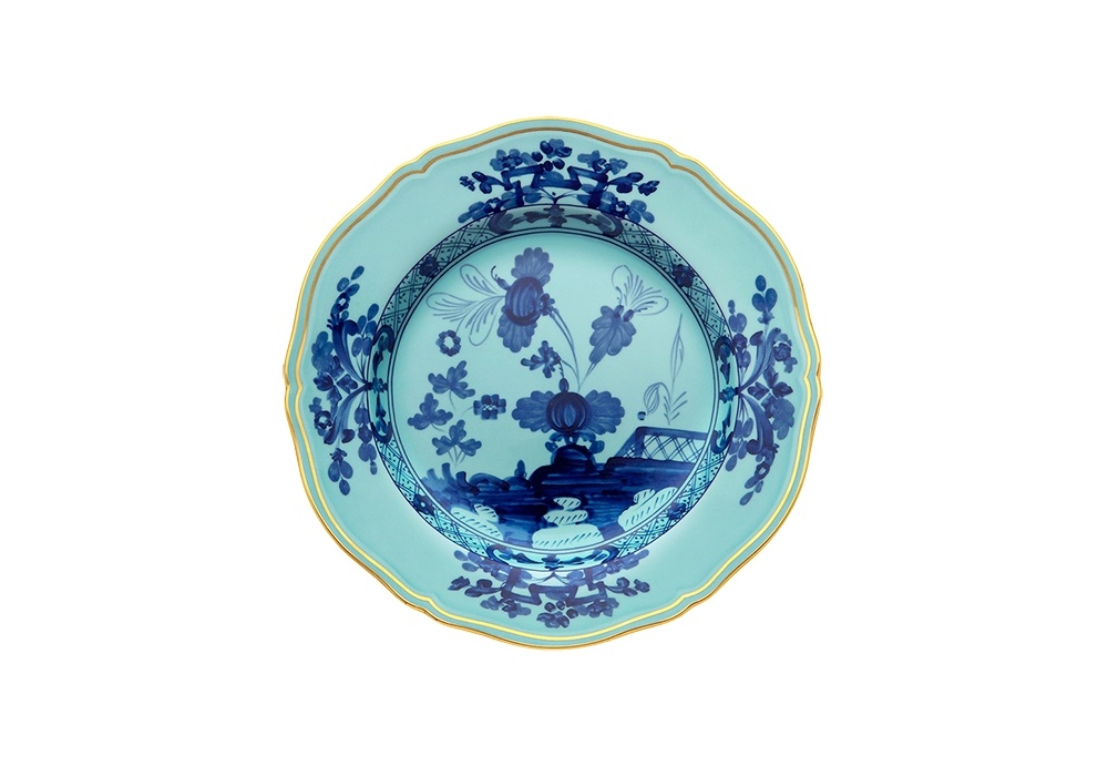 Piatto Dessert Oriente Italiano Iris diseñado por Ginori 1735 es un plato plano decorado para el postre.