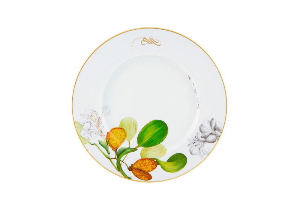 Amazonia diseñado por Vista Alegre con Ecoarts es un plato llano realizado en porcelana con decoraciones inspiradas en la flora y la fauna.
