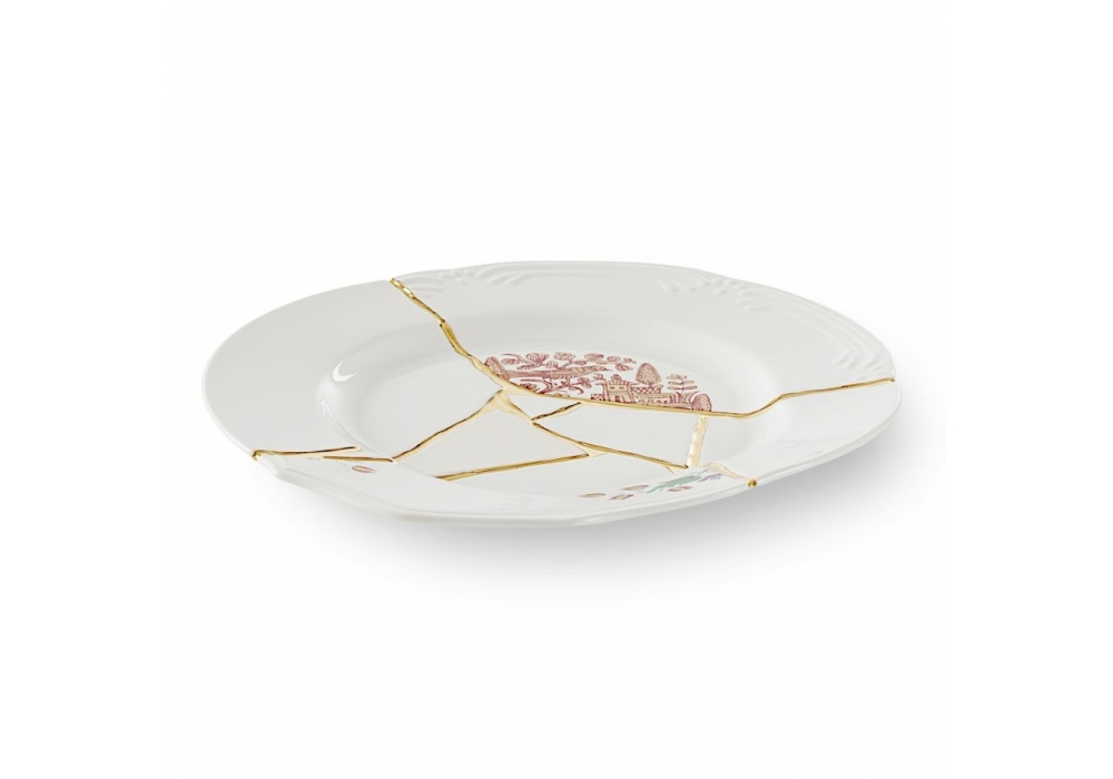 Kintsugi diseñado por Marcantonio para Seletti es un plato llano de porcelana blanca decorado con varios pigmentos. Kntsugi está disponible en diferentes modelos.