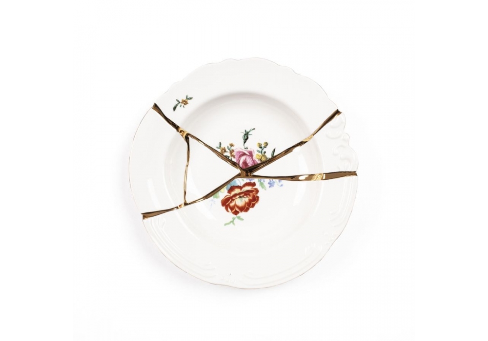Kintsugi diseñado por Marcantonio para Seletti es un plato de sopa de porcelana blanca decorado con varios pigmentos. Kntsugi está disponible en diferentes modelos.