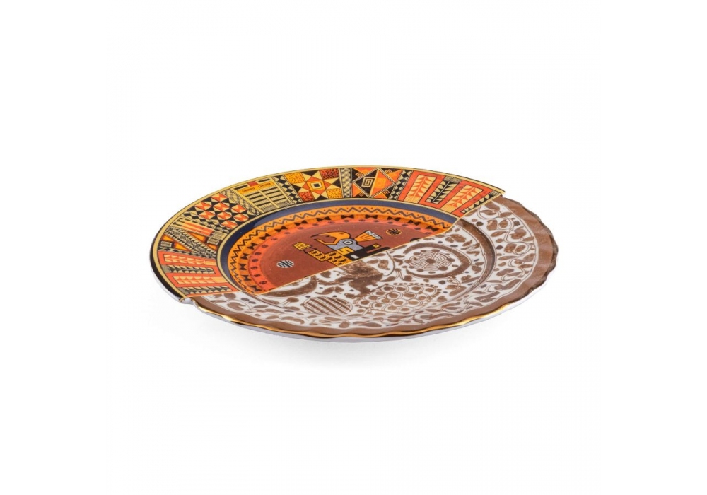 Hybrid Mitla diseñado por CTRLZAK para Seletti es un plato llano de porcelana decorado con varias figuras y pigmentos.