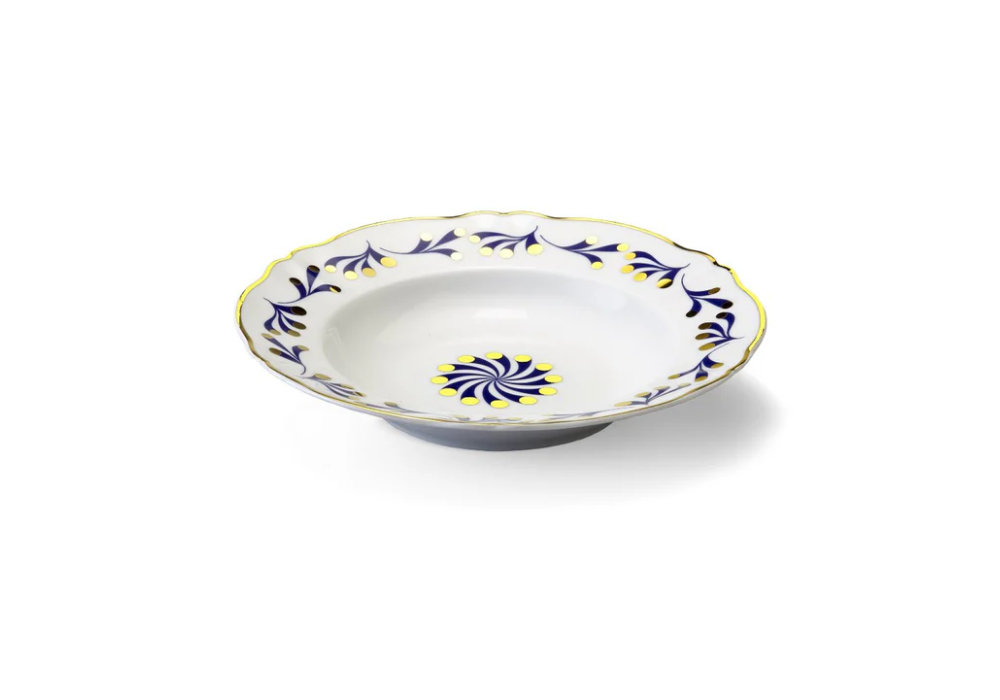 Marino firmado por design LaTigre para Bitossi Home es un plato hondo de porcelana con calcomanía y detalles dorados. Apto para lavavajillas y un máximo de 250 lavados. No apto para microondas.