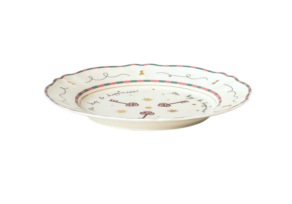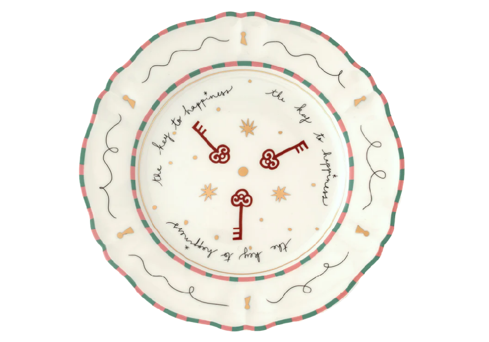 Chiavi firmado por design Pangea para Bitossi Home es un plato de porcelana con calcomanía y detalles dorados. Apto para lavavajillas y un máximo de 250 lavados. No apto para microondas.