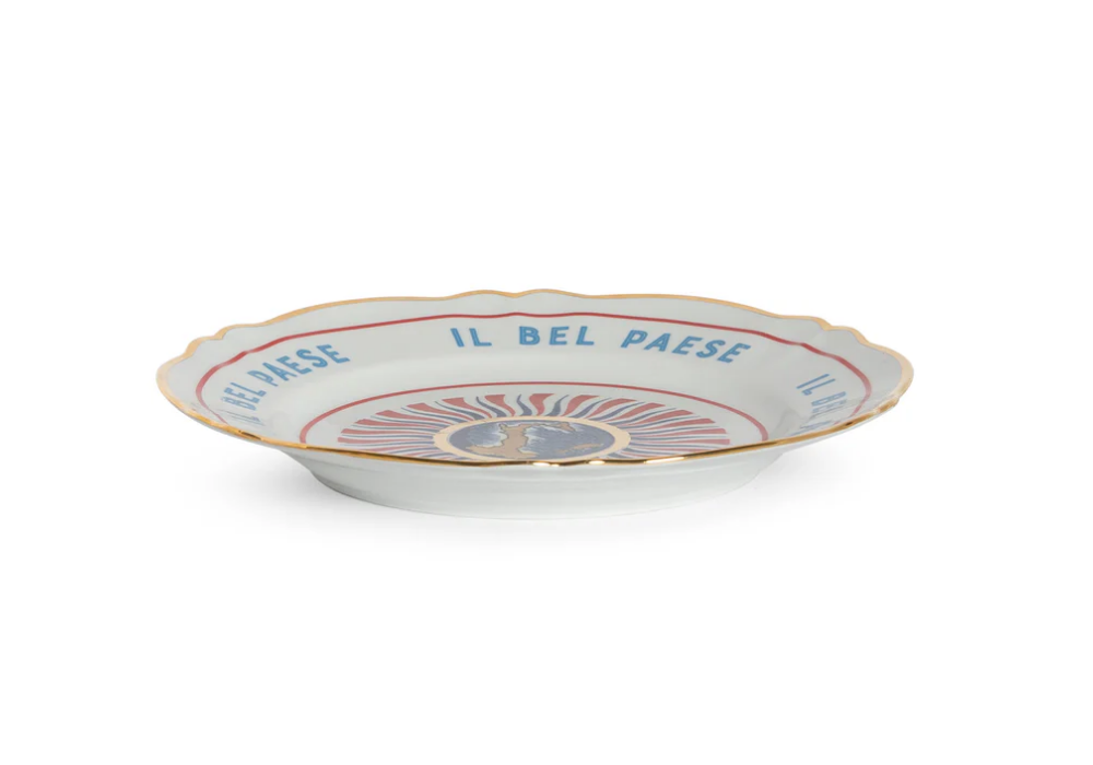 Italia firmado por design Sam Baron para Bitossi Home es un plato de porcelana con calcomanía y detalles dorados. Apto para lavavajillas y un máximo de 250 lavados. No apto para microondas.