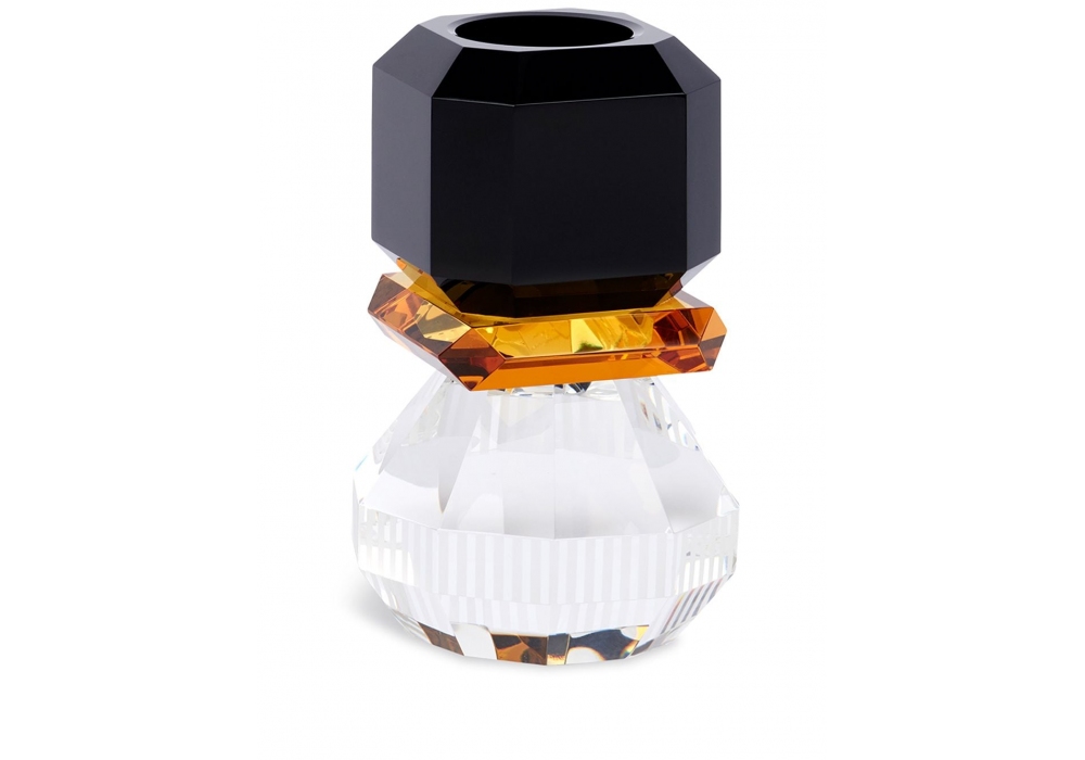 Phoenix producido y firmado por Reflections Copenhagen es un portavelas en cristal estructurado por varios elementos geométricos tallados y acabados a mano en negro, ámbar y transparente.