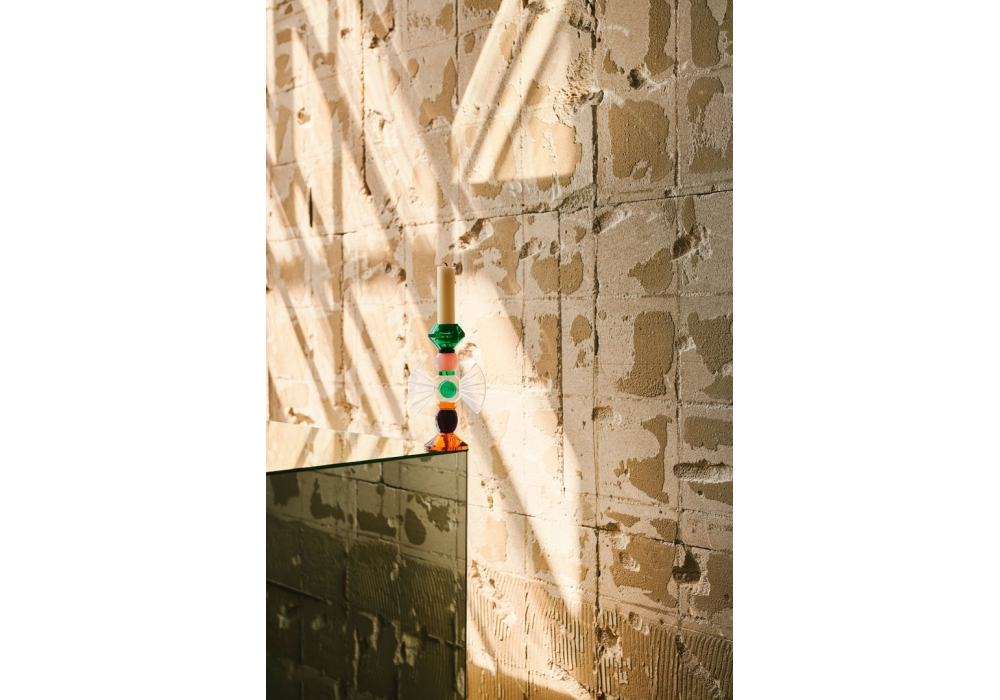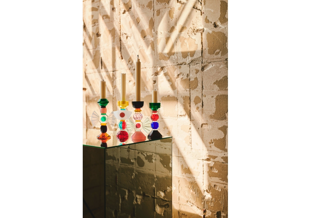 Carmina producido y diseñado por Reflections Copenhagen es un portavelas de cristal estructurado por varios elementos geométricos tallados y acabados a mano en rosa pálido, azul claro, burdeos, neón, amarillo, naranja y rosa.